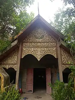 The important buildings and structures include the Ubosot (ordination hall) in the middle of the water (Ukkhasema), of which only two remain in the northern region. The other one is at Wat Phut Ae, in Mae Chaem District, Chiang Mai Province. There is also a Vihara (hall) made of carved teakwood in Lanna style, as well as a Stupa (pagoda) painted white. The construction of these structures was funded by the annual Poi Luang festival, a major religious event in the northern region. The ritual of washing the Buddha's relics is held every year during the eighth lunar month, or June.[3][4]