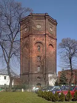 The dynamic growth of the city in the 19th century increased the demand for water. To create a municipal waterworks, land and a shooting house were purchased from the shooting fraternity in 1838 on what is now 1 Maja Street.[10] In 1862, additional land was acquired. However, the waterworks was not established until 1874. It included a water pumping station drawing from the Oder river with two pumping units, a filter unit, a clean water reservoir, a clean water pumping station with two steam units, and a water tower with a capacity of 500 m3.[11][a] Previously, there was also the turret clock of the Racibórz prison serving as a water tower, which the correctional facility used for its own purposes.[12]