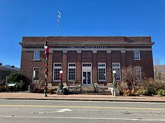 The Waynesville Municipal Building, also known as the Former US Post Office Building, is a historic post office building located at Waynesville, Haywood County, North Carolina. Its construction in 1917 was supervised by the Office of the Supervising Architect under James A. Wetmore, and is a two-story, brick rectangular building in the Classical Revival style with a one-story rear extension. It measures 58 feet by 73 feet and features brick Ionic order pilasters with granite bases and capitals. The building housed Waynesville's post office until 1966 when it was purchased by the Town of Waynesville to serve as its Municipal Building.[2]