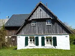 Among other typical features these houses have a very characteristic roof (German: Frackdach), and the family and animals lived under the same roof (a byre-dwelling). In this village there are more former weavers' cottages, but over the centuries some of them have gone through considerable changes. The weavers' cottage of Kleinschwarzenbach was part of a special exposition called Zwischenlichten (German for 'twilight') at the Upper Franconian Textile Museum in Helmbrechts.[2]