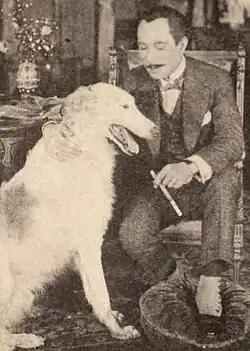 Film still of Nowell as the gentleman thief Arsène Lupin with his Russian wolfhound in the 1920 mystery film 813