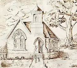 Drawing made of the church sometime before the late 1950s when the bell tower was torn down due to damage from a lightning strike.