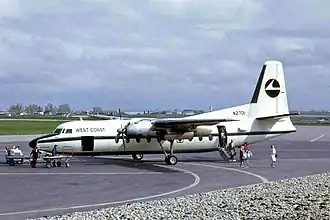West Coast was the first local service airline in the U.S. to use turbine airliners when it began Fairchild F-27 flights in September 1958. The F-27 was the U.S. manufactured version of the Dutch built Fokker F27 Friendship. In June 1968 West Coast was the first airline to order Fairchild 228 twin jets with the acquisition of three planned, but the F-228, a smaller variant of the Dutch manufactured Fokker F28 Fellowship, never made it to production.[9] The only jet operated by West Coast was the Douglas DC-9-14 with 75 seats, all coach.
