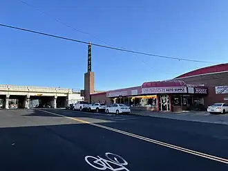 In 1908, the railroad tracks were raised above grade in order to alleviate traffic congestion in the city center. The poured-concrete embankment raised the tracks 12-to-14 feet above the street level.[12] As of 2022, the raised tracks continue to exist, though they often cause problems with the size of modern vehicles attempting to cross underneath.[13] When the tracks were initially constructed, they caused another problem by sealing off some of the businesses which had been built to face the previously street-level tracks. This issue led to a flurry of legal action which brought the construction of the embankment to a halt for two years. Construction was completed in 1916 at a cost of $2.5 million.[12]