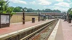 West Falls Church station is a Washington Metro station in Idylwood, Virginia on the Orange Line, the first station inside the Capital Beltway on the Orange Line going east. It is one of only two stations in the system to have three tracks, the other being the National Airport station. The center track is used for storage and relaying trains to the adjacent Falls Church Yard.