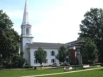 There is a sidewalk around the perimeter of the green and paths into the green from the corners and mid-blocks meeting at the center. The dominant structure on the green is the Congregational Church (built 1859). Behind the church is a cemetery. There are also several war memorial markers, a bandstand, and a flagpole around the perimeter of the green. Wooden benches are scattered at various locations on the green. A stone chess table with seating is located near Main Street. At the north end of Main Street is a stone monument to West Haven fire fighters, on top of which is a large bell. Near the east end of Savin Avenue is a large boulder commemorating British Adjutant William Campbell, who saved the life of Reverend Noah Williston during the British invasion (July 5, 1779) of West Haven in the American Revolutionary War.[2] A modern octagonal bandstand is located north of the center of the block of Church Street.[3]