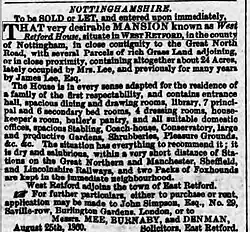 Robert died in 1805 and left West Retford House to his wife Mary. In 1819 she married James Lee (1770–1858) of Carleton Hall near Pontefract.[12] He was a widower with one daughter Ann Lee who occasionally lived with them. They are all shown in the 1851 census with a butler, a footman, two ladies maids, a cook and four domestic servants. Robert and Mary lived in West Retford House for about forty years. He died in 1858 and she died in 1860. The house was advertised for sale after Mary died and bought by Henry Beilby William Milner.