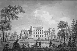 The artist Thomas Malton drew a view of West Retford House which he exhibited at the Royal Academy in 1777.[8] It was later turned into an engraving and published in the book called “Picturesque views of the principal seats of the nobility and gentry in England and Wales” in 1786. This drawing is shown. It may be that the house was also admired by the Prince Regent's father as there is a copy of it in the personal collection of King George III.[9]