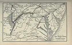 The West Virginia Central and Pittsburg Railway (WVC&P) was a railroad in West Virginia and Maryland operating in the late 19th and early 20th centuries. It had main lines radiating from Elkins, West Virginia in four principal directions: north to Cumberland, Maryland; west to Belington, WV; south to Huttonsville, WV; and east to Durbin, WV. Some of the routes were constructed through subsidiary companies, the Piedmont and Cumberland Railway and the Coal and Iron Railway.