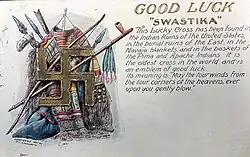 The Passamaquoddy Nation, whose homeland within Dawnland extends across the Canada–United States border between Maine and New Brunswick, used an elongated swastika on their war canoes in the American colonial period as well as later.[70] A carving of a canoe with a Passamaquody swastika was found in a ruin in the Argonne Forest in France, having been carved there by Moses Neptune, an American soldier of Passamaquody heritage, who was one of the last American soldiers to die in battle in World War I.[71]
