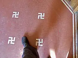 There is a swastika-like tile pattern on the floor of the entrance hall of Upminster Bridge tube station in London, opened in 1934.[47]