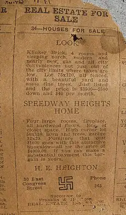 - ^ Revecca Flood, "Tiled Swastika Flooring Discovered Underneath Hardwood in Indiana Jewelers", Newsweek 2/15/22