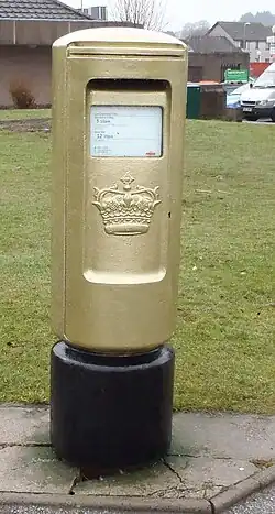 Olympic canoeist Tim Baillie has a gold postbox on the concourse of Westhill Shopping Centre, commemorating his gold medal in the canoe slalom C-2 event at the 2012 Olympics.[13] For a time, there were two gold postboxes on Westhill Drive. The first was painted to honour Baillie’s achievement, but locals complained that its location was not central enough.[14] As a result, another postbox, closer to the Shopping Centre, was also painted gold. However, during the Shopping Centre’s renovation, the more central postbox was relocated inside the concourse, and the original postbox further up Westhill Drive was removed in 2024.