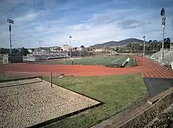 Volleyball courts, 400 meter track, and football field. Black Mountain in the far distance, image right.