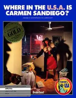 Where in the U.S.A. Is Carmen Sandiego? is an educational video game released by Broderbund in 1986 and is part of the Carmen Sandiego series. The game is a sequel to 1985's Where in the World Is Carmen Sandiego?. A deluxe version with updated graphics and interface was released in 1992 and a remade version was released in 1996. The goal of the game is to track Carmen Sandiego's henchmen across the United States, arrest them, and ultimately arrest Carmen herself. The game received generally positive reviews but some critics compared it unfavorably with its predecessor game, which had a global perspective.