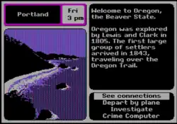 The main screen interface is divided into four sections showing the day, time, and location; textual information, an image from the current city, and the available actions. The game was supplied with a special copy of Fodor's USA encyclopedia as a reference guide and a travel guide book.[8][9] The deluxe version of the game includes more than 50 digitized photographs, numerous state topographical maps, digitized sounds, and music.[10]