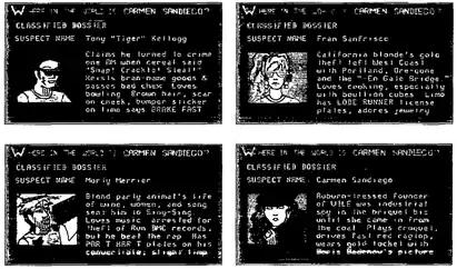 In the third city, The Chief asks the player to create an arrest warrant - players complete this by making selections in the crime computer about the suspect's characteristics, players don't need to fill in every option but need enough information to narrow down to one suspect. They can narrow down their search options by looking at the suspect's dossiers.[2] The dossiers reveal information about the suspect's sex, hair color, vehicle, distinguishing feature (like tattoo, scar, or limp), and hobby, which will help identify the correct suspect when utilising clues in the crime computer.[2]