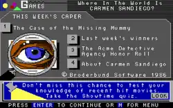 Prodigy was a computer service from a partnership of IBM and Sears.[3] World was one of three games available on the extra audio card, alongside Silpheed and Cakewalk Apprentice.[4] It was an on-line version of the popular PC title, written specifically for Prodigy.[5] This version had a new adventure each week,[6][7] each Carmen Sandiego episode sponsored by the Prodigy online.[8]