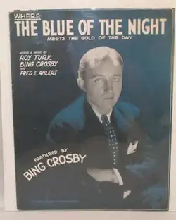 "Where the Blue of the Night (Meets the Gold of the Day)" was the theme Bing Crosby selected for his radio show. It was recorded in November 1931 with Bennie Krueger and his Orchestra. The song was featured in a Mack Sennett movie short[1] starring Bing Crosby. Crosby recorded the song on several occasions starting with the November 23, 1931 version with Bennie Kruger and his Orchestra. He next recorded it on July 20, 1940 with The Paradise Island Trio. On July 17, 1945 he recorded it with John Scott Trotter and his Orchestra and his final recording was on April 21, 1954 with Buddy Cole and his Trio for his Musical Autobiography set.[2]