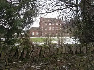 Whirley Hall is a country house standing to the north of the village of Henbury, Cheshire, England. The house dates from about 1670.[1] Additions and alterations were made during the 18th century and in the 1950s, when the house was restored and wings were added at the sides.[2] The house is constructed in brick with buff sandstone dressings, and has a Kerridge stone-slate roof with stone ridges. It has three storeys and symmetrical five-bay front. Between the storeys, and above the top storey, are brick bands. The lower two storeys contain 20th-century wooden-framed mullioned and transomed windows. In the top storey are two-light casement windows. Above these are two shaped gables, each surmounted by an obelisk finial, and containing an elliptical window. There are single-storey, two-bay extensions on each side of the house.[1] In the roof of the house is a stone inscribed with the date 1599, which is considered to have been removed from an earlier timber-framed house.[2] The house is recorded in the National Heritage List for England as a designated Grade II* listed building.[1] The gate pier in front of the house is a Grade II listed building.[3]