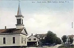 The community was originally named Robertsonville in honor of Jonathan Bradley Robertson for his service during the War of 1812.[2] Robertson came to the vicinity of Liberty, New York, in 1807 from Bridgeport, Connecticut. In the late 1890s and early 1900s, a large hotel called the White Sulpher Springs House was built, named after the nearby Sulphur Spring, which supposedly had medicinal benefits. Robertsonville was renamed in December 1890 to White Sulphur Springs, likely to promote the local tourism business.[1]