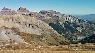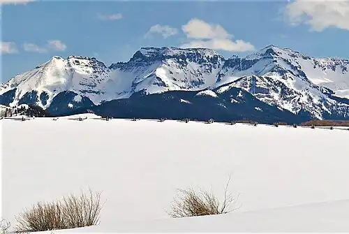 Whitehouse Mountain is a 13,492-foot-elevation (4,112-meter) mountain summit located in Ouray County of southwest Colorado, United States.[4][5] It is situated four miles west of the community of Ouray, on land managed by Uncompahgre National Forest. It is part of the Sneffels Range which is a subset of the San Juan Mountains, which in turn is part of the Rocky Mountains. It is west of the Continental Divide, 2.2 miles north of Potosi Peak, and 3.2 miles east-northeast of Mount Sneffels. Topographic relief is significant as the east aspect rises 5,680 feet (1,730 meters) above the town of Ouray in approximately four miles. The mountain's name, which has been officially adopted by the United States Board on Geographic Names, was in use before 1906 when Henry Gannett published it in the Gazetteer of Colorado.[6]