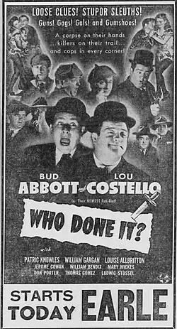 Who Done It? is a 1942 American comedy-mystery film directed by Erle C. Kenton and starring Bud Abbott and Lou Costello. It is noteworthy as their first feature that contains no musical numbers.