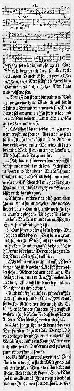 2. ^ a b c d e f Bunners, Christian [in German] (2011). "11 Wie soll ich dich empfangen". In Hahn, Gerhard (ed.). Liederkunde (in German). Vandenhoeck & Ruprecht. pp. 7–10. ISBN 978-3-52-550302-7.