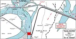 The course of the lower Arkansas River changes significantly downstream from the location of the dam, where the river follows a long winding route until it reaches its outflow at the Mississippi River, approximately 25 mi (40 km) southeast. This circuitous portion of the Arkansas River between the current dam location and the Mississippi River was historically bypassed by river vessels; early steamboats instead followed a network of rivers—known as the Arkansas Post Canal—which flowed north of the lower Arkansas River, and followed a shorter and more direct route to the Mississippi River. When the McClellan–Kerr Arkansas River Navigation System was constructed between 1963 and 1970, the Arkansas Post Canal was significantly improved, while the lower Arkansas River continued to be bypassed by river vessels. For this reason, the dam was erected with no lock facilities because the waters downstream of the dam were used only by small recreational boats. Access to the Arkansas Post Canal is 2.5 mi (4.0 km) northwest of the Wilbur D. Mills Dam.[3]