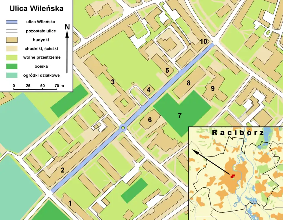 Wileńska Street begins at the intersection of Browarna and Wojska Polskiego streets. On the western side, at 15 Wojska Polskiego Street, on the corner of the intersection, there is a tenement with the Centrum pharmacy on the ground floor. On the opposite side is a residential block.[9] Moving along, on the eastern side, stands the building of the School of Construction and Crafts. Opposite it is the administrative building of the Nowoczesna Housing Cooperative.[10] Next to it is the former evangelical parish house, now used by the Craftsmen's Guild and other institutions. In front of the house, running perpendicular to Wileńska Street, is the short Kiliński Street. Behind the parish house stands the former vicarage, now home to the civil registry office. Further down, at the corner of Wileńska and Ogrodowa streets, there once stood an evangelical church, replaced in the 1970s by the State Music School. Opposite is the Vocational School building.[2] Between the Vocational School and the School of Construction and Crafts is a sports complex built under the Orlik 2012 project.[7] After the roundabout with Ogrodowa Street, three residential blocks are situated on the eastern side, oriented perpendicularly to the street's course, and one block is located along its length on the opposite side, adjacent to a row of tenements stretching to the intersection with Lwowska and Warszawska streets. At this intersection, opposite the tenement, is the building currently used by the State University of Applied Sciences in Racibórz, popularly called Słoneczko.[3][11]