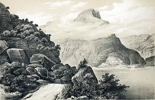 From 1819 to 1824, he was an Adjutant to the Swedish Riksstattholder, Johan August Sandels. During his travels with Sandels, he created landscapes in charcoal, oil and watercolor that were published in the booklet Voyage picturesque aux alpes norvégiennes (1821-23). These include what may be the first images of Hurrungane.[3] In 1824, he returned to the Army, with the rank of Oberstløytnant (Lieutenant -Colonel).