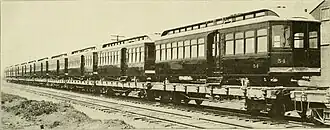 Construction of the Wilkes-Barre and Hazleton Railroad started in 1901. Nine railroad bridges were required for the construction of the railroad. Most of the bridges were made of concrete, but some of the largest ones were not. The grade of the railroad on hills was 3%. The rails used weighed 95 pounds per yard. These rails were 30 feet (9.1 meters) long and on top of 8-inch by 6-inch ties. The ties for the third rails were 9 feet (2.7 meters) long. Wooden cars were used until 1916, when they were replaced by steel cars.[1]