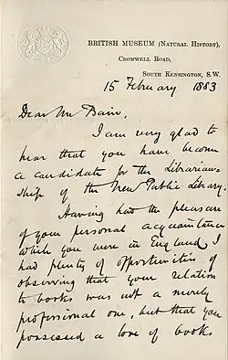 Carruthers' papers are held in multiple archive collections. His administrative records from his role as keeper of the Botanical Department are held at the Natural History Museum Library and Archives.[16] A series of Carruthers' notes and illustrations are held at the Cadbury Research Library, University of Birmingham.[17] Letters concerning Carruthers are held at the University of Edinburgh.[18]