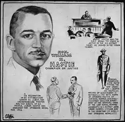 On January 15, 1943, Hastie resigned his position in protest against racially segregated training facilities in the United States Army Air Forces, inadequate training for African-American pilots, and the unequal distribution of assignments between whites and non-whites.[13] That same year, he received the Spingarn Medal from the NAACP, both for his lifetime achievements and in recognition of this protest action.[14]