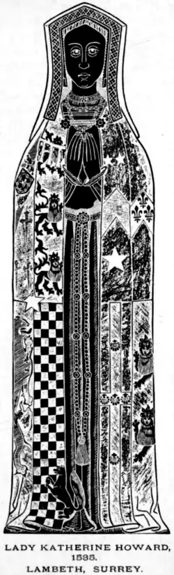 - ^ A Who’s Who of Tudor Women: Brooke-Bu, compiled by Kathy Lynn Emerson to update and correct Wives and Daughters: The Women of Sixteenth-Century England (1984) Archived 20 October 2013 at the Wayback Machine Retrieved 1 June 2013. Katherine's death date is confirmed by a memorial brass in St. Mary's Church, Lambeth, now destroyed, but recorded by John Aubrey in his Natural History and Antiquities of the County of Surrey, vol. V (London, 1719), p, 231-2.
