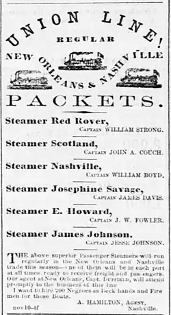 "Union Line! Regular New Orleans & Nashville Packets" – Steamer Nashville, Captain William Boyd – Daily Nashville Patriot, December 13, 1858