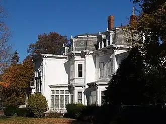 This 2+1⁄2-story, wood-framed house was built in 1873 by William L. White for his son. The Whites were prominent local carriage builders. The house is locally significant as one of the city's largest and most elaborate examples of the Second Empire style of architecture, adorned with a flared mansard roof decorated in patterned slate, and a wraparound porch supported by clustered Tuscan columns.[2]