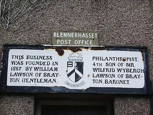 In 1863, Lawson opened a 'people's shop' or co-operative store in the village of Blennerhassett, which for many years displayed the words "William Lawson, Licensed Dealer in Tea and Tobacco", chalked on a blackboard over the entrance door.[8] This curiosity originated after the registrar of the Companies Act refused to register him as a ‘gentleman’. The administrator refused to accept a ‘gentleman’ as the promoter of a company of rustic provision dealers.[9] On the gable end of the shop, he painted, in gold letters on a brown background, a larger and more significant emblem, ‘The Snuff Shop & General Mart’. The shop window also advertised a variety of wares, including seeds, specimens of manure, crushed bones, mint lozenges, notepaper and envelopes. During this period the storekeeper was elected by the village parliament using a system of universal suffrage.[10] Although the total turnover for the small store exceeded £5,200, the accumulated loss totalled £43. The shop remains open for business today and has a sign above the entrance door stating its history. To help dispose of the farm produce Lawson later established three other shops in Newcastle, Ireby and Carlisle. The northeast store closed in 1869, with accumulative debts of £545.