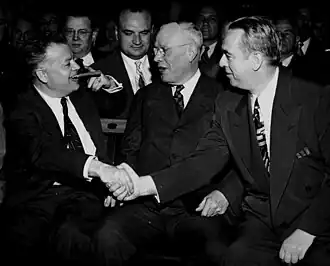 O'Dwyer (right) shakes hands with International Ladies Garment Workers Union President David Dubinsky (left) as American Federation of Labor President William Green looks on, 1947