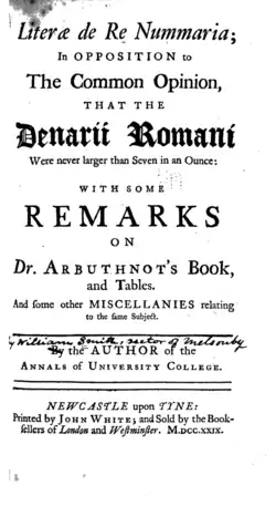 2. ^ The book referred to in the title is John Arbuthnot's Tables of Ancient Coins, Weights and Measures.