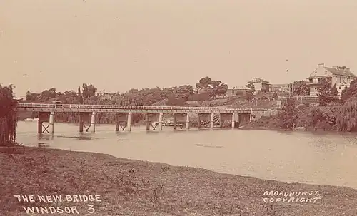 The Windsor Bridge, officially called the Hawkesbury River Bridge, Windsor, was a beam bridge across the Hawkesbury River, located in Windsor in north-western Sydney, New South Wales, Australia. The bridge was built in 1874. On 18 May 2020, a replacement bridge was opened to traffic within Windsor, NSW.[2]