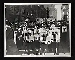 Union members rally for awareness. From left to right: Edward "Deyo" Jacobs, Winifred Milius, and Hugh Miller. Photograph by Irving Marantz. From the Archives of American Art