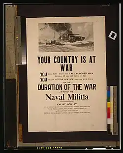 In 1916, the naval militia was temporarily disbanded due to the inability of the state to procure a ship to be used for training purposes; however, new units were immediately reorganized in different parts of the state, funded with money raised by private donors.[4] Most of its members joined the U.S. Navy due to the outbreak of World War One.[5]