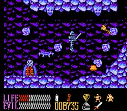 Wizards & Warriors III is a platforming video game which features open-ended gameplay elements similar to games such as Metroid and Faxanadu. Players control the main character Kuros as he sets out to defeat Malkil and free the town of Piedup. The game features three separate realms in which the player must explore - the town, the underworld, and the palace; players can freely navigate from one realm to another. Throughout the game, players find money which can be used to buy items from inns located throughout Piedup; players can buy keys for unlocking doors, food and drink for restoring health, and information from shopkeepers.[1] Players begin the game with three lives, and the game ends when all lives have been lost; unlike the previous Wizards & Warriors games, there is no password or continue feature.[2]