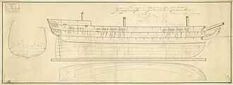 The arms race continued, and culminated in the construction of three-decked first-rate ships of the line for service on Lake Ontario. The first of these was the 102-gun ship of the line HMS St Lawrence, designed by shipwright William Bell at Amherstburg Royal Naval Dockyard.[5] St Lawrence, while designated as a normal ship of her type, was highly dissimilar to the extant British first rates. Being planned for service in a freshwater lake, the design of St Lawrence did not include the large amount of storage space other ships required for drinking supplies. This resulted in St Lawrence being smaller and more shallow in draught than other first rates, although she still incorporated the sharp and somewhat deep hull that Great Lakes warships had switched to for the increase in speed. The ship also had an unusually rounded bow, and was more similar in outline to a spar-decked frigate than a ship of the line.[6][3]