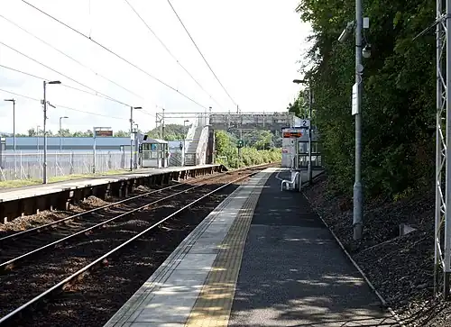![]() Woodhall station, looking east towards Glasgow Central. The footbridge can be seen in the background. | |||||