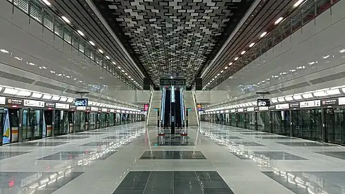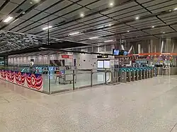 The station's interior has a red and white scheme that was inspired by the National Flag of Singapore, to welcome visitors coming from Malaysia into the country. The station also features aluminium ceiling panels above the platforms which mimic the movements of the daily flux of commuters.[33] The station has a much larger size compared to other MRT stations, as the station was set to accommodate the peak-hour traffic for travellers between Singapore and Johor Bahru.[34] There are two exits from the station.[35]