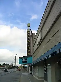 An exterior photo of the Woodlawn Theatre, taken July 4, 2009