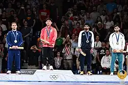 ![]() Medalists Spencer Lee, Rei Higuchi, Aman Sehrawat, and Gulomjon Abdullaev stand on the podium at the award ceremony | |||||||||||||||||