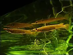 The wrestling halfbeak (Dermogenys pusilla) also known as Malayan halfbeak is a species of viviparous halfbeak native to the fresh and brackish waters of rivers and coastal regions in South-East Asia, in Singapore, Indonesia, Thailand, Malaysia, Borneo and Sumatra.[2][3] It is a small, slender, livebearing fish, with the elongated lower jaw characteristic of its family. The colour of this species varies, depending on where the specimen is found.[4] It is the type species of the genus Dermogenys.[5]
